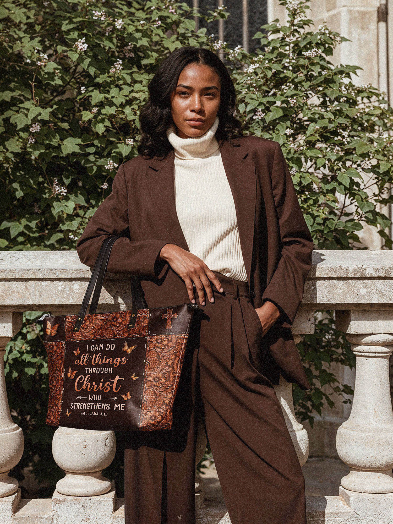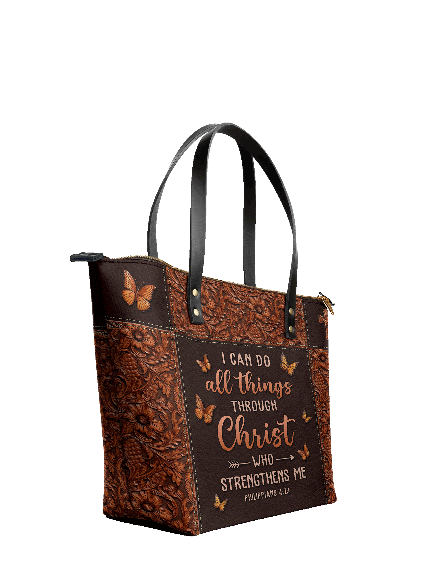 "Believe" - Philippians 4:13 Leather Tote Bag